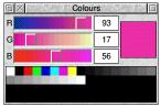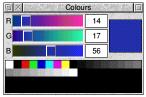 DA's Picture was released at the time the Risc PC came out, and it does, of course, support 24 Bit colours. DA's picture has its own colour selection window and does not use the standard RISC OS colour picker - as you can see on the pictures. Each bar has its own colour, but when you move one slider the colour of all the bars will change. Even if this is not the professional way to do it, you will see that it is interesting to play around with. Not only RGB is supported but CMYK and HSB too, available from a submenu. To select a colour you have to click the left or right mouse button over the coloured square.
