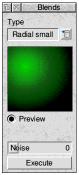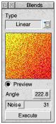 It is possible to add some noise to the blend; this is shown in the picture too. In the linear mode you can set the angles initially to 0, 90, 180 and 270 degrees from a submenu. You set the colours with the left and right mouse button.