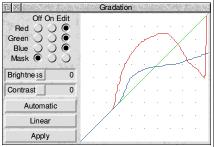 With the Gradation window you can change the brightness and contrast for the whole picture or only for one colour. You can see the difference directly in the picture so that you can play with it. If you would like to make any changes permanent, you have to press the Apply button. You can alter the graphical display with the mouse. To reset it, just press the Linear button on the left site.