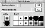 Dies ist der ganz normale Stift. Es können verschiedene Stiftspizen gewählt werden, wie man rechts im Bild sehen kann. Auch hier gilt wieder das Prinzip, das für rechts und links unterschiedliche Spitzen und Andrücke gewählt werden können.