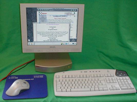 Slym ist ein Netzwerkrechner von Cumana, mit einem Motherboard von Castle. Slym - hinter diesem doch recht merkwürdigen Namen verbirgt sich ein intelligentes Konzept. Intelligent deswegen, weil der eigentliche Rechner im Fuße des Bildschirms (15" TFT LCD) untergebracht ist. Das spart viel Platz und Kabelgewirr am Arbeitsplatz, da der Rechner im Prinzip nur ein Strom- und Netzwerkkabel braucht. Außerdem läßt sich der Computer auch hinter dem Monitor installieren und an der Wand befestigen. Tastatur und Maus sind über Funk mit dem Rechner verbunden.